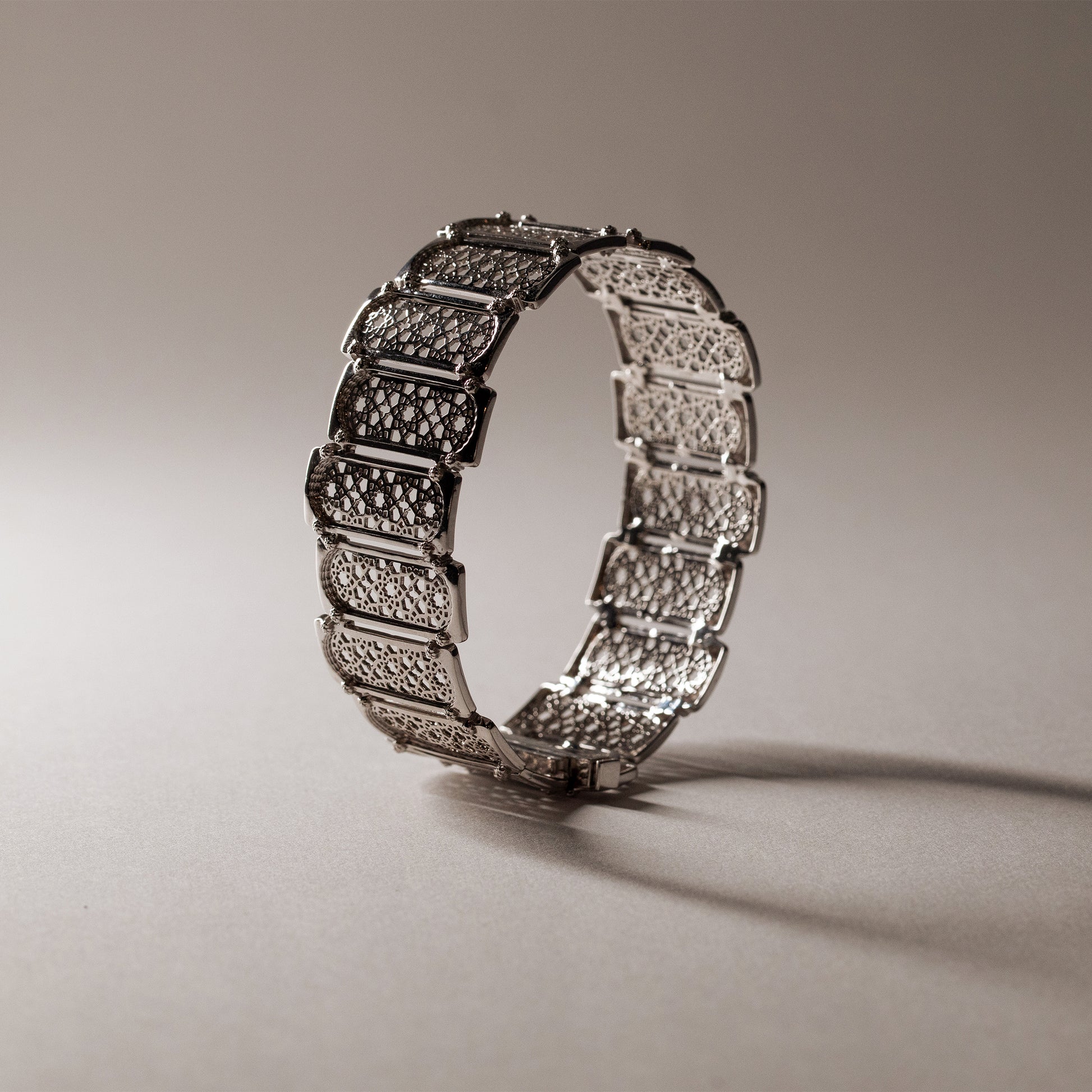 Inspired from Fatimid traditional architecture, the bangle reminisces over the historical Fatimid gates, that are often ornamented with oriental patterns that are inspired from Ancient Egyptian culture and architecture. The remarkable profile of the gates surrounds each module of the bangle to reflect the identity of the piece in every detail.