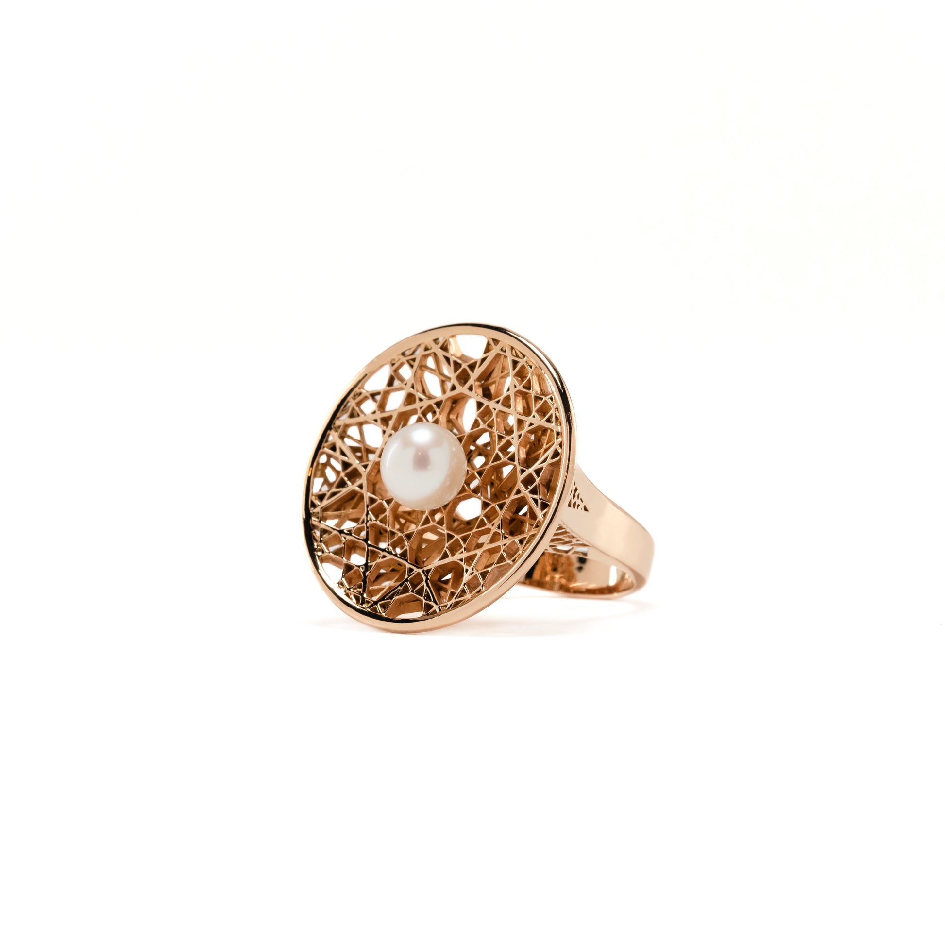 Inspired from The Louvres Museum Dome by Jean Nouvel. Pearl Dome Ring imitates the form and structure of the dome that penetrates light through the arabesque perforated pattern.